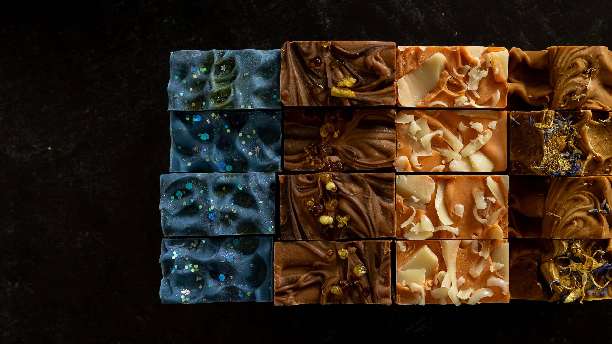 Chai Tea Latte Artisan Soap: Olive Oil, Coconut Oil, Organic and Sustainably Grown Palm Oil, Water, Lye, Castor Seed Oil, Fragrance, Almond Oil, Sodium Lactate, Skin-safe Colorants, Kaolin Clay, Citric Acid, Mint Leaves, Calendula, Chamomile, Lavender, Blue Cornflowers
